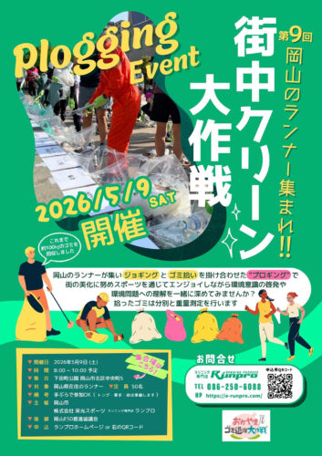 2026年04月20日 5 / 9(土)開催 – 街中クリーン大作戦-プロギング 岡山のランナーが集いジョギングとゴミ拾いを掛け合わせた“プロギング” 街の美化に努めスポーツを通じてエンジョイしながら環境意識の啓発や環境問題へ理解を一緒に深めてみませんか? 拾ったゴミは分別と重量測定を行います。 参加申し込みはこちらから < 前の記事